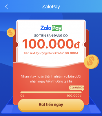ZaloPay tặng miễn phí cho khách hàng đang sử dụng 100.000đ hoàn toàn miễn phí,